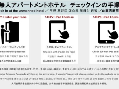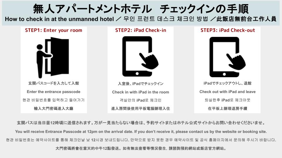 A無人フロントのため、ご滞在中の無料清掃、ゴミ回収、リネン・タオル交換はございませんことをご理解くださいませ。