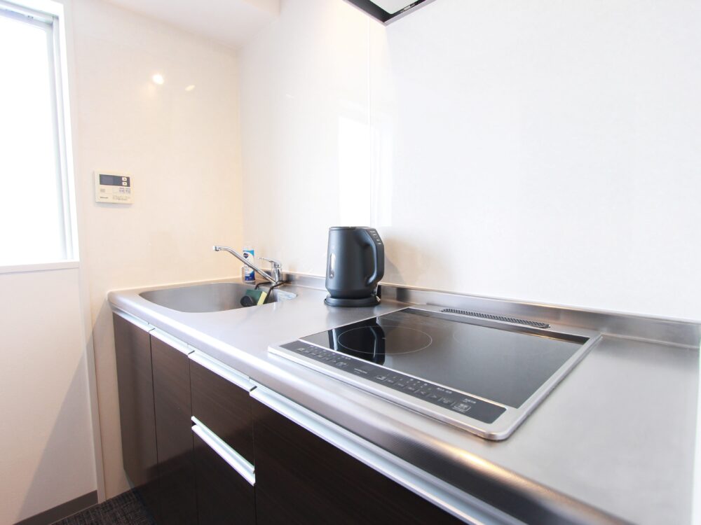 ・もし食器を洗われる場合は、水切りラックやふきんのご用意はございませんので、備え付けのキッチンペーパーをご利用くださいませ。